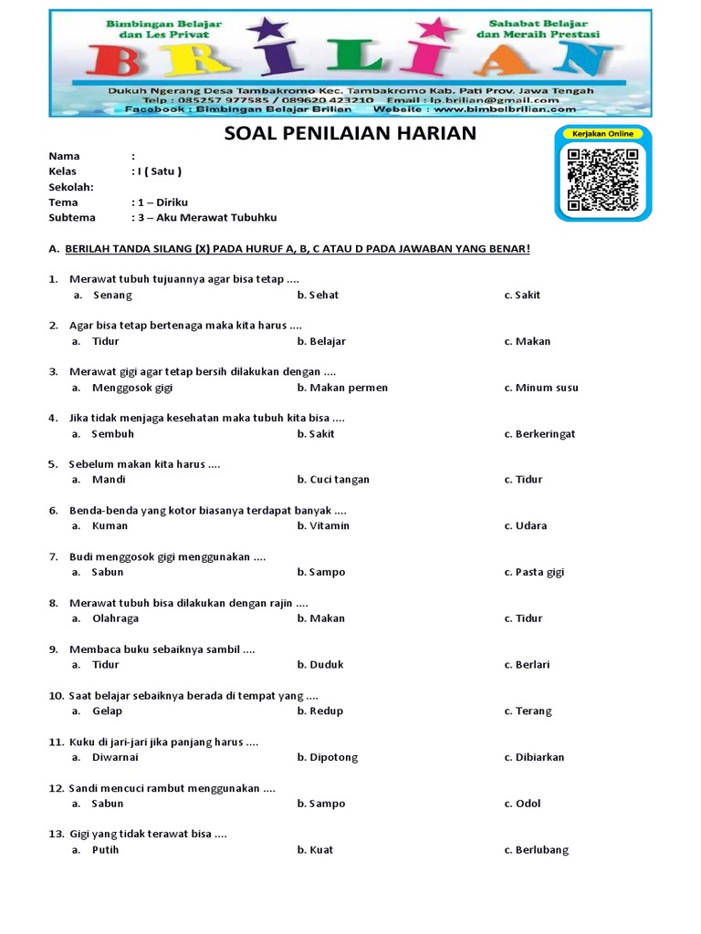 Anak kelas 1 SD mulai belajar tentang rutinitas dan kemandirian. Soal-soal di bagian ini akan mengeksplorasi kebiasaan baik dan keterampilan dasar yang mereka pelajari.