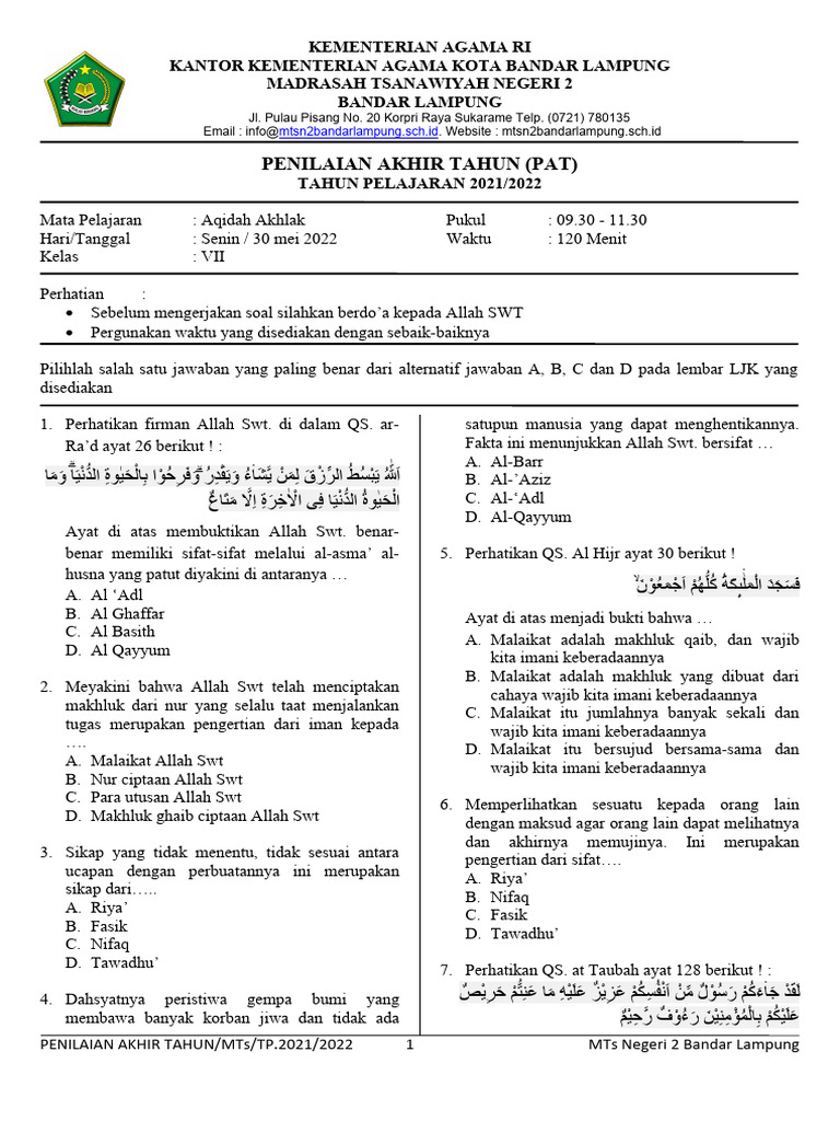 Pendidikan Agama Islam, khususnya mata pelajaran Aqidah Akhlak, memegang peranan krusial dalam membentuk karakter dan kepribadian peserta didik. Di kelas 7 semester 2, materi Aqidah Akhlak fokus pada penguatan keimanan, pemahaman terhadap sifat-sifat Allah, serta pembiasaan akhlak terpuji dan menjauhi akhlak tercela. Artikel ini akan menyajikan contoh-contoh soal Aqidah Akhlak kelas 7 semester 2 yang komprehensif, meliputi pilihan ganda dan uraian, disertai penjelasan singkat mengenai materi yang diujikan. Tujuannya adalah membantu siswa dalam mempersiapkan diri menghadapi ujian, serta menjadi referensi bagi guru dalam menyusun soal.