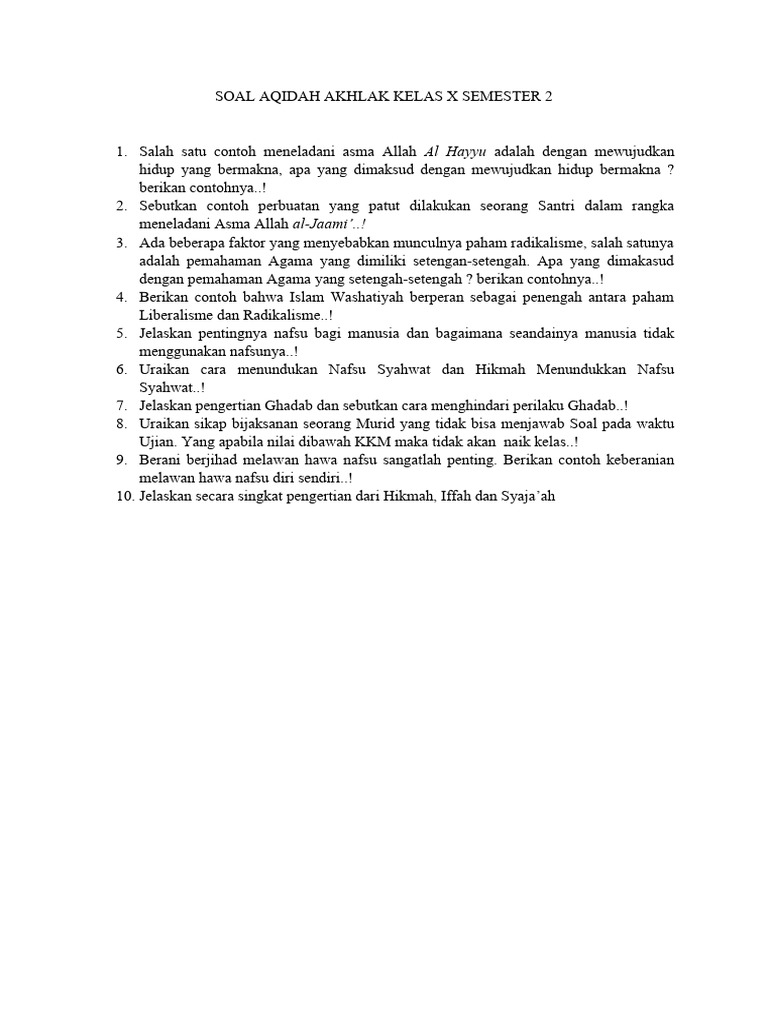 II. Contoh Soal Aqidah Akhlak Kelas 10 Semester 2 dan Pembahasannya